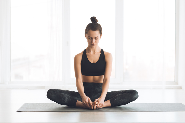 Woman sitting in butterfly position with bare feet