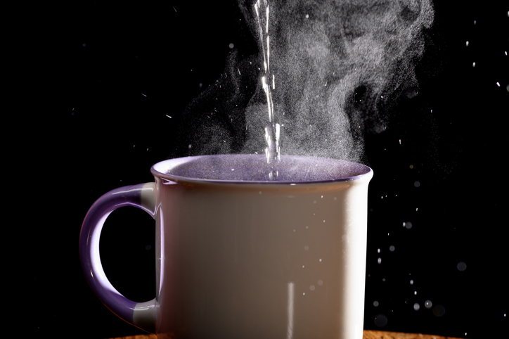 A stream of hot steaming water being poured into a tea cup